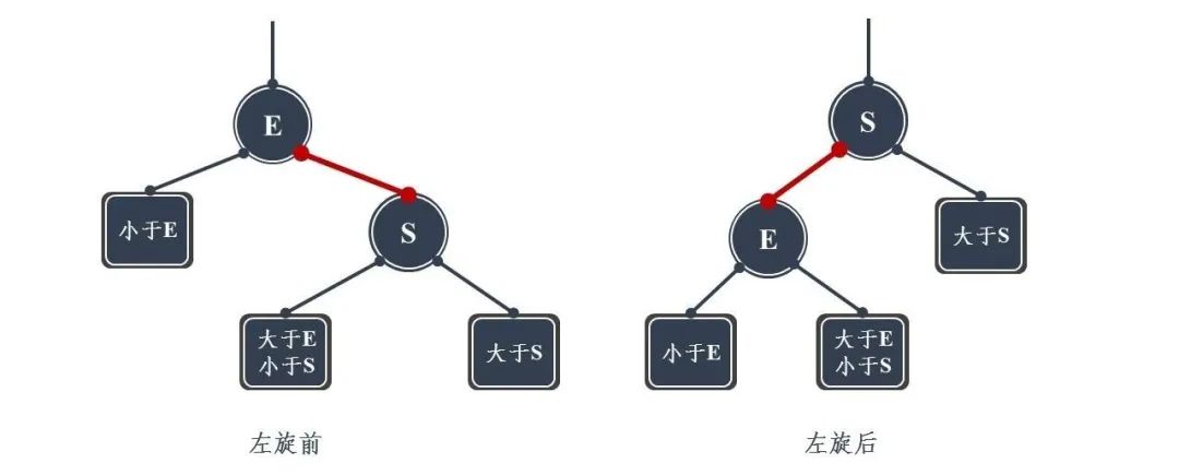 右旋:s是当前需要左旋的节点,e是当前节点的父节点。右旋转是左旋转的镜像旋转。