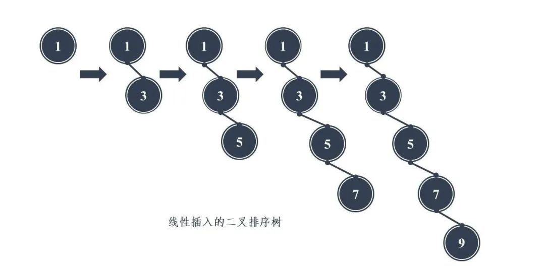 创建平衡二叉树是为了解决二叉排序树插入时线性排列的问题。由于二叉排序树本身是有序的,当插入一个有序度很高的序列时,生成的二叉排序树会继续插入某一方向字数上的数据,导致最终的二叉排序树退化为链表,从而恶化了二叉树的查询和插入效率。