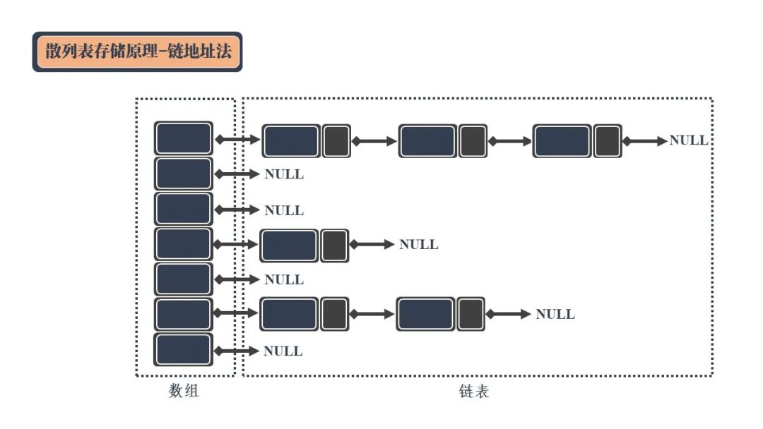 左侧数组的每个成员包括一个指针,指向一个链表的头。每发生一个冲突的数据,就将该数据作为链表的节点链接到链表尾部。这样一来,就可以保证冲突的数据能够区分并顺利访问。