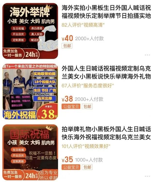 最早,“黑人喊话祝福视频“发源于淘宝,不过最近这几年淘宝对这类业务的封禁比较厉害,现在搜“非洲小孩喊话”、“海外举牌”这些关键词基本找不到相关店铺了。