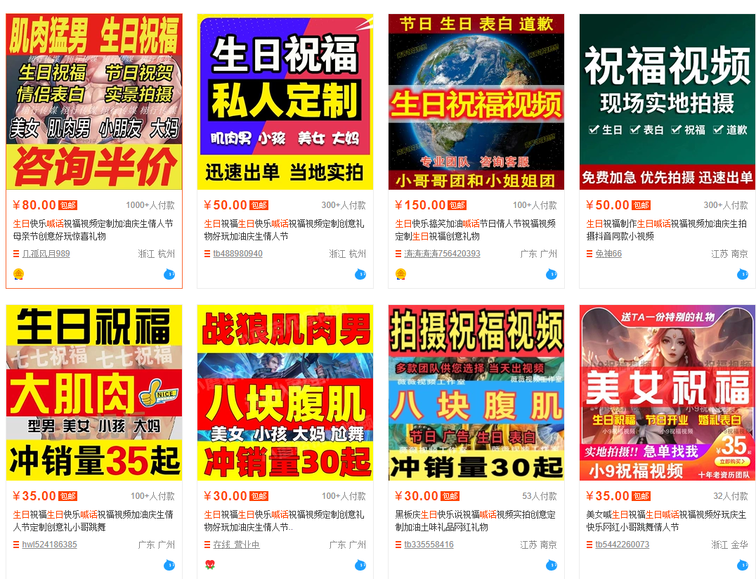 淘宝搜“生日喊话”还能搜到一些,但都比较隐蔽,但有些可能不是非洲的。如今这些业务早就转移到微信、小红书、抖音这些平台。