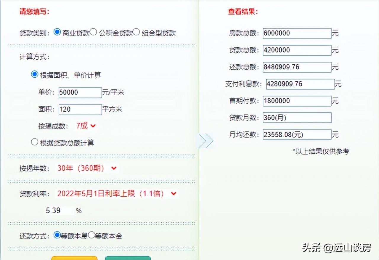 如果30年房贷按照之前首套房贷的LPR4.9%上浮15-20%,那么利息就要承担一半。贷款的时候银行会出工资的50%,很多人会选择工资总收入的60-70%来多贷款。比如一套总价600万的房子,贷款420万等于本息,每月需要还款23558.08元,还款总额为4280909.76元。如果你不能偿还贷款,你的亲戚和朋友不能帮助你。
