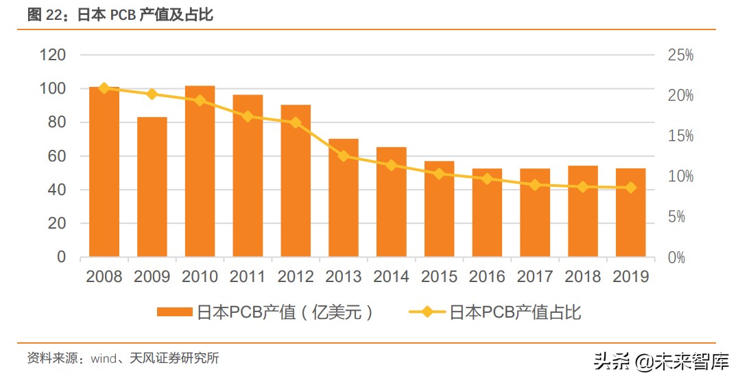 日本PCB制造商的产值/比例逐年下降,FPC制造商由于管理不善,正计划出售FPC资产。日本PCB产值从2008年的100.95亿美元下降到2019年的52.72亿美元,占全球PCB的比重从21%下降到9%。从世界前十来看,奇胜15-18年FPC产值变化率为-37%,住友电气为-54%。日本厂商的FPC板状况不佳,住友电气的FPC板18、19和20Q1-3的营业利润分别为0.72、-0.26和-1.6亿元。