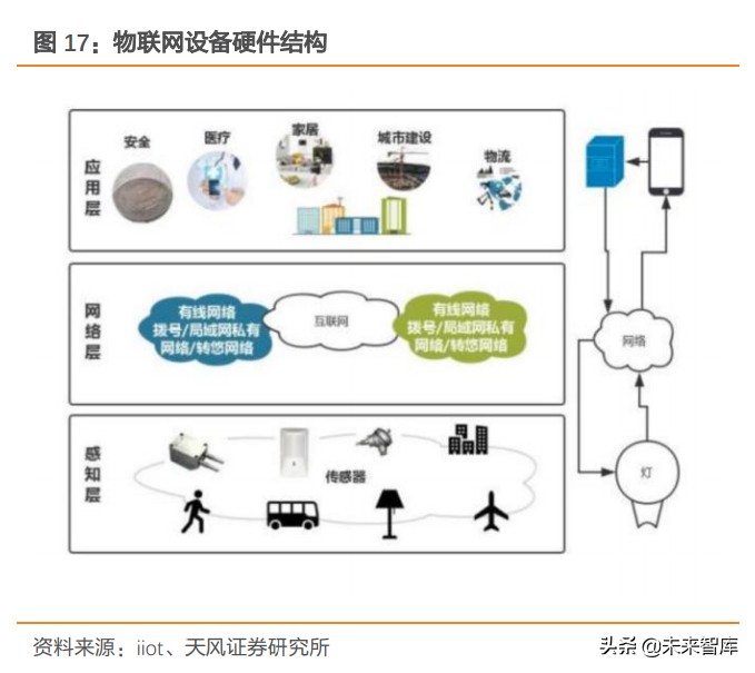 物联网设备激增推动PCB需求增长。未来,随着物联网设备上电子元件数量的增加,FPC的比例将进一步增加。物联网设备的三大功能——感知、组网、应用,对应的是三大硬件需求——传感器、通信芯片、MCU/SoC。传感器用于收集周围环境的信息,MCU/SoC用于处理来自传感器的数据,并根据不同的应用场景做出正确的响应。利用通信芯片实现端到端、端到云的互联互通。物联网设备搭载传感器、通信芯片、SoC/MCU等电子元器件,催生大量PCB需求。未来,物联网设备电子元器件的集成度将会提高,这就要求PCB布局更加灵活,尺寸更小,FPC应用的比重有望进一步提高。