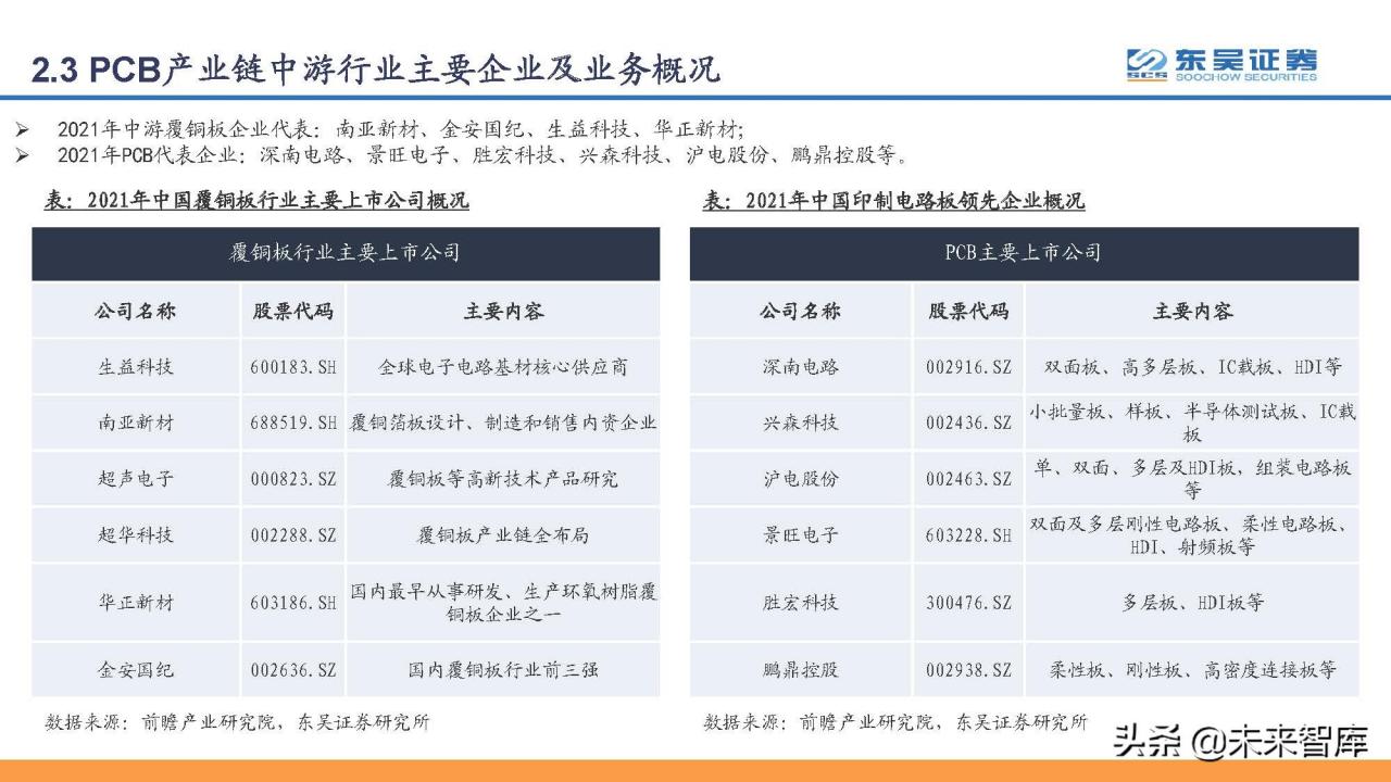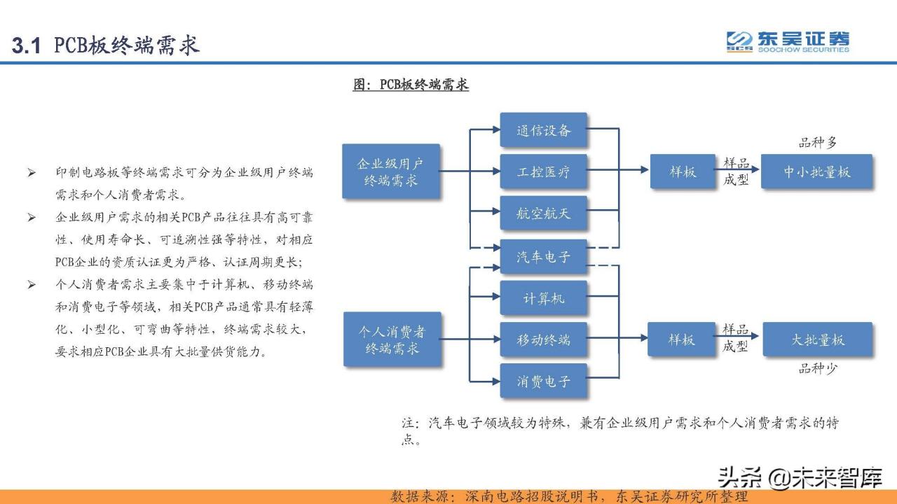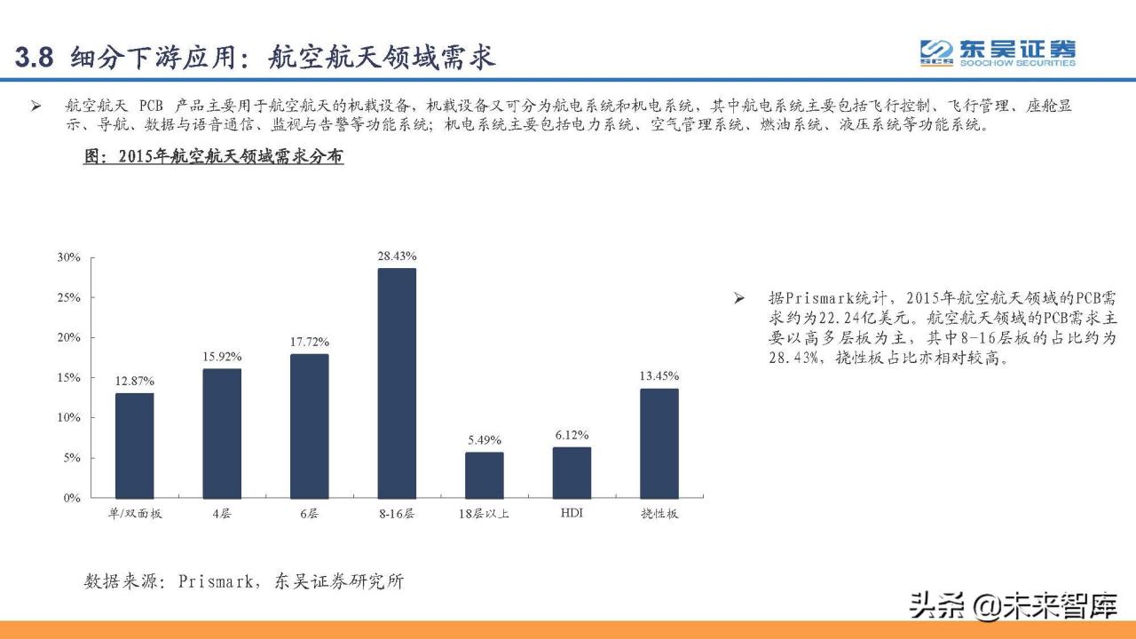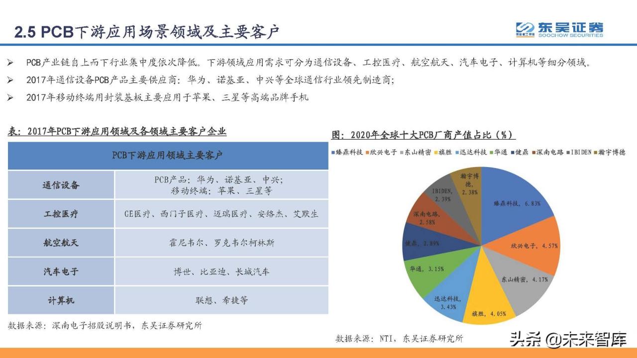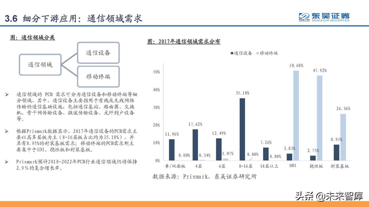 PCB行业集中度自上而下递减。下游应用需求可分为通信设备、工控医疗、航空航天、汽车电子、计算机等子领域。2017年通信设备PCB产品主要供应商:华为、诺基亚、中兴等全球通信行业领先厂商;2017年,移动终端用封装基板主要用于苹果、三星等高端品牌手机。(报告来源:未来智库)