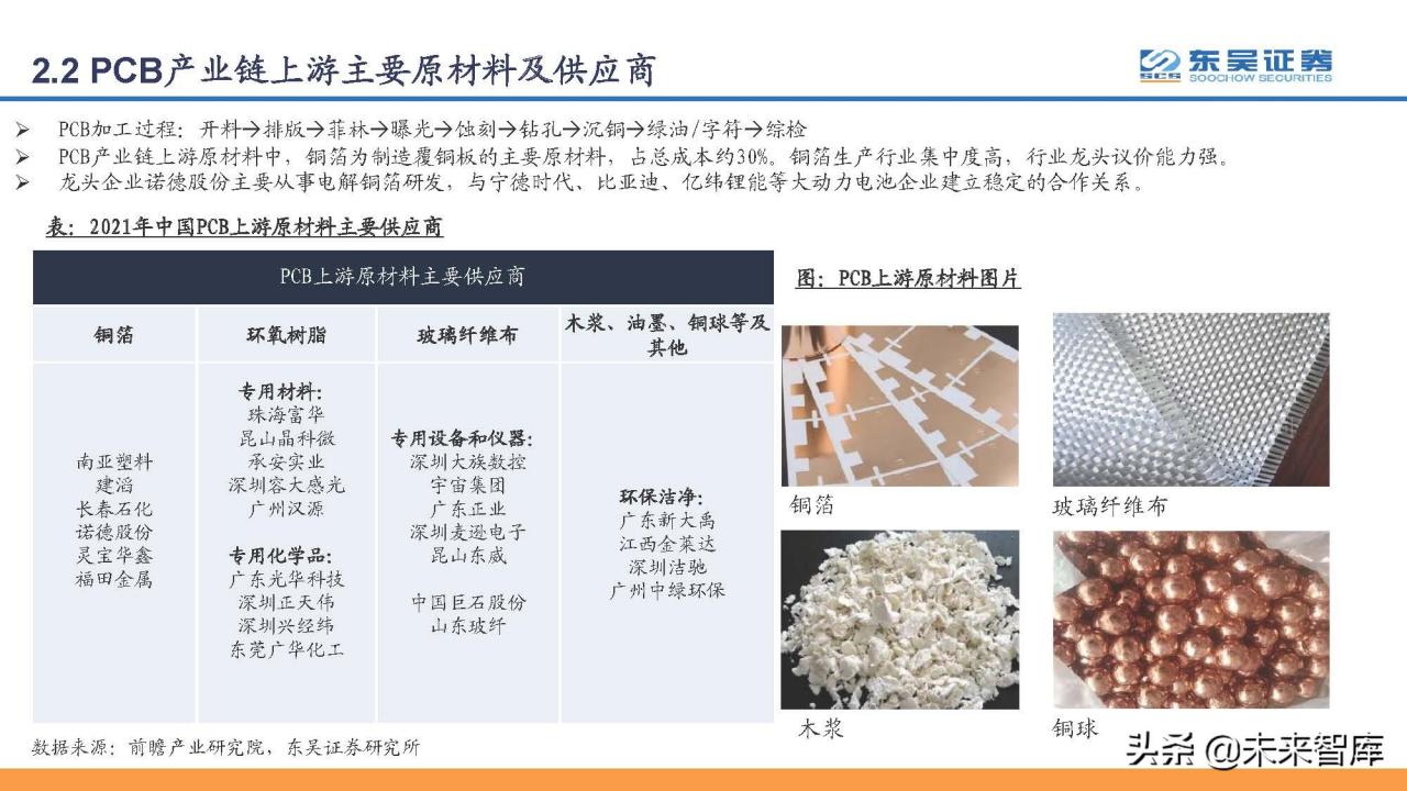 PCB产业链清晰。上游材料有铜箔、树脂、玻璃纤维布、木浆、油墨、铜球,其中铜箔、树脂、玻璃纤维布是三大主材。