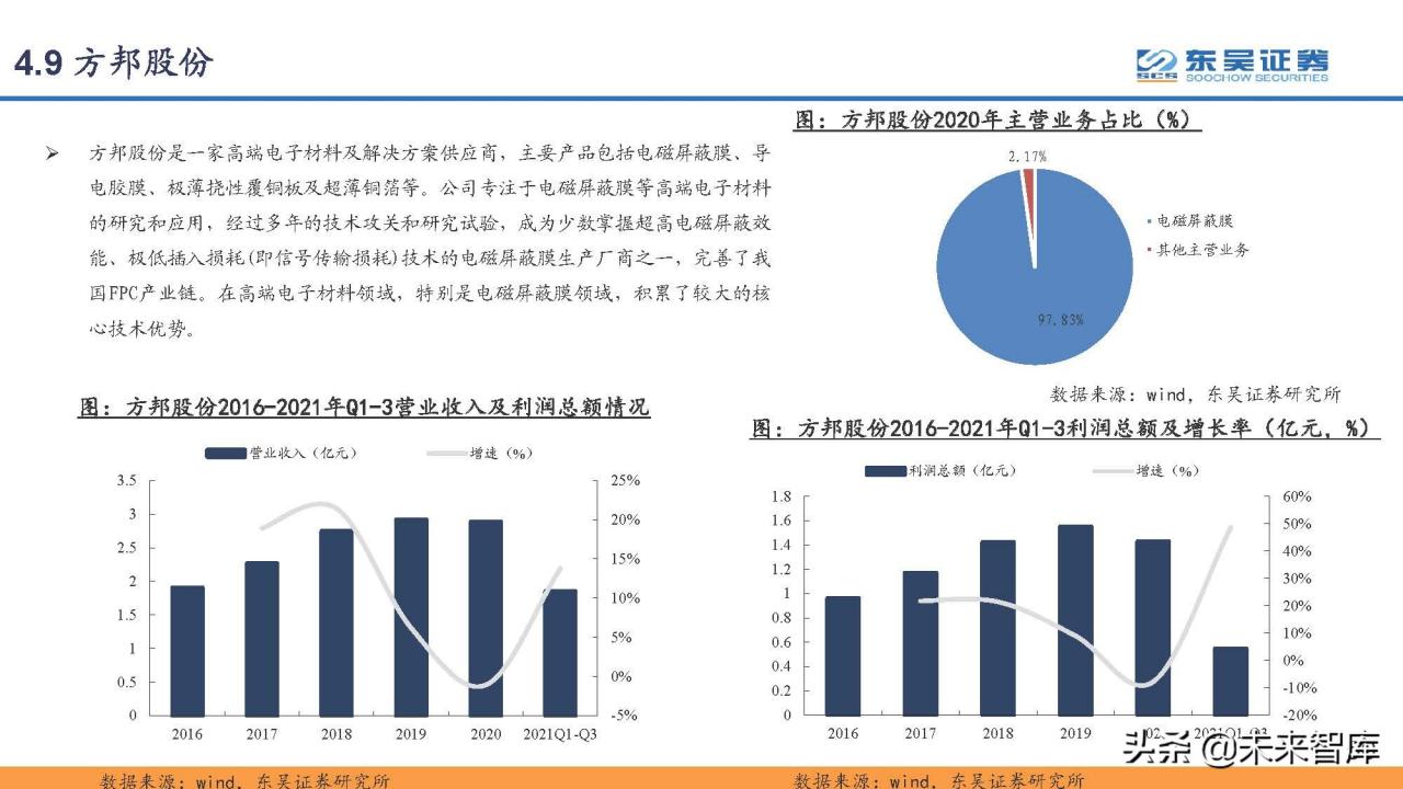 方邦股份是电子材料和解决方案的高端供应商。其主要产品包括电磁屏蔽膜、导电膜、超薄挠性覆铜板和超薄铜箔。公司专注于电磁屏蔽膜等高端电子材料的研究和应用。经过多年的技术攻关和研究实验,成为国内为数不多的具有超高电磁屏蔽效率和极低插入损耗(即信号传输损耗)的电磁屏蔽膜制造商,完善了中国FPC产业链。在高端电子材料领域,尤其是电磁屏蔽膜领域,积累了巨大的核心技术优势。