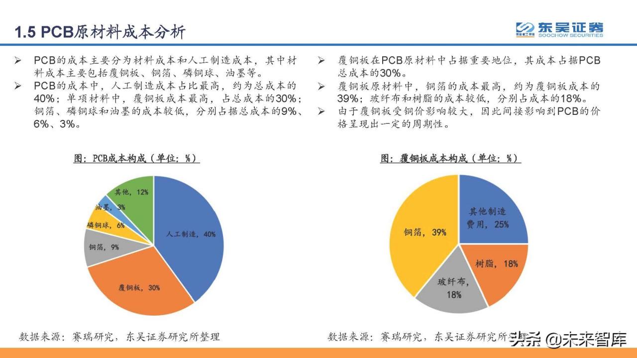 PCB的成本主要分为材料成本和手工制造成本,其中材料成本主要包括覆铜板、铜箔、磷铜球、油墨等。PCB成本中,人工制造成本占比最高,约占总成本的40%;单一材料中,覆铜板成本最高,占总成本的30%;铜箔、磷铜球、油墨成本较低,分别占总成本的9%、6%、3%。