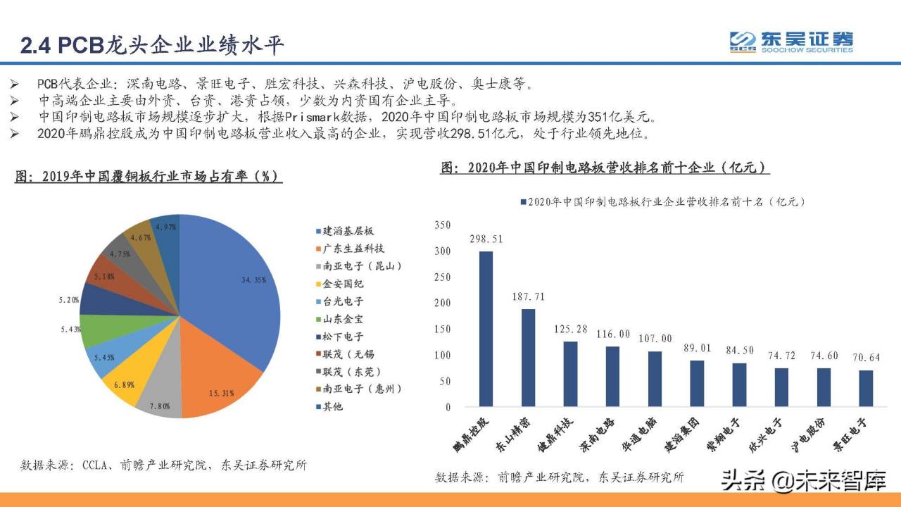 PCB代表企业:深南电路、王静电子、洪升科技、兴森科技、沪电、奥士康等。高端企业以外资、台资、港资为主,少数以内资国企为主。中国的印刷电路板市场正在逐步扩大。Prismark数据显示,2020年中国印刷电路板市场规模为351亿美元。2020年,丁鹏控股成为中国印刷电路板收入最高的企业,收入298.51亿元,处于行业领先地位。