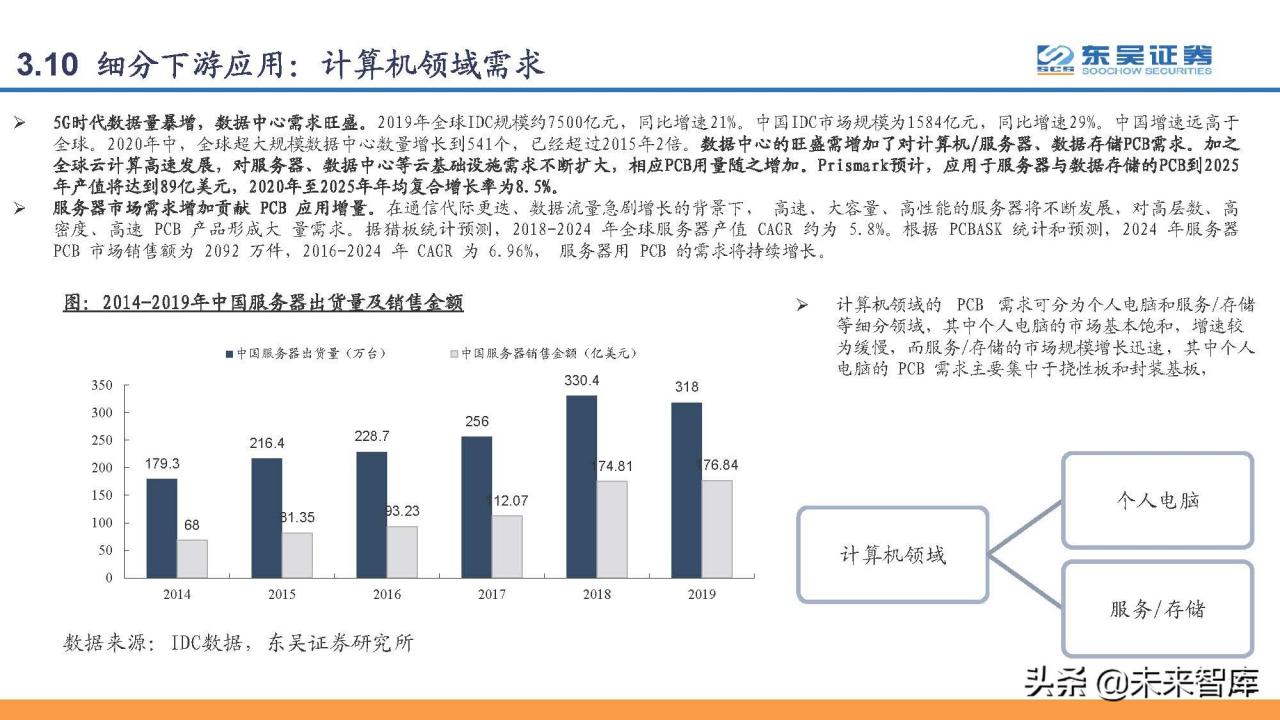 计算机领域需求:5G时代数据量爆发,数据中心需求旺盛。2019年,全球IDC规模约为7500亿元,同比增长率为21%。中国IDC市场规模为1584亿元,同比增长率为29%。中国的增长率远高于全世界。2020年中期,全球超大规模数据中心数量将增至541个,是2015年的两倍。数据中心的旺盛需求增加了对计算机/服务器和数据存储PCB的需求。再加上全球云计算的快速发展,对服务器、数据中心等云基础设施的需求不断扩大,相应的PCB用量也在增加。Prismark预测,到2025年,用于服务器和数据存储的PCB产值将达到89亿美元,2020年至2025年年均复合增长率为8.5%。