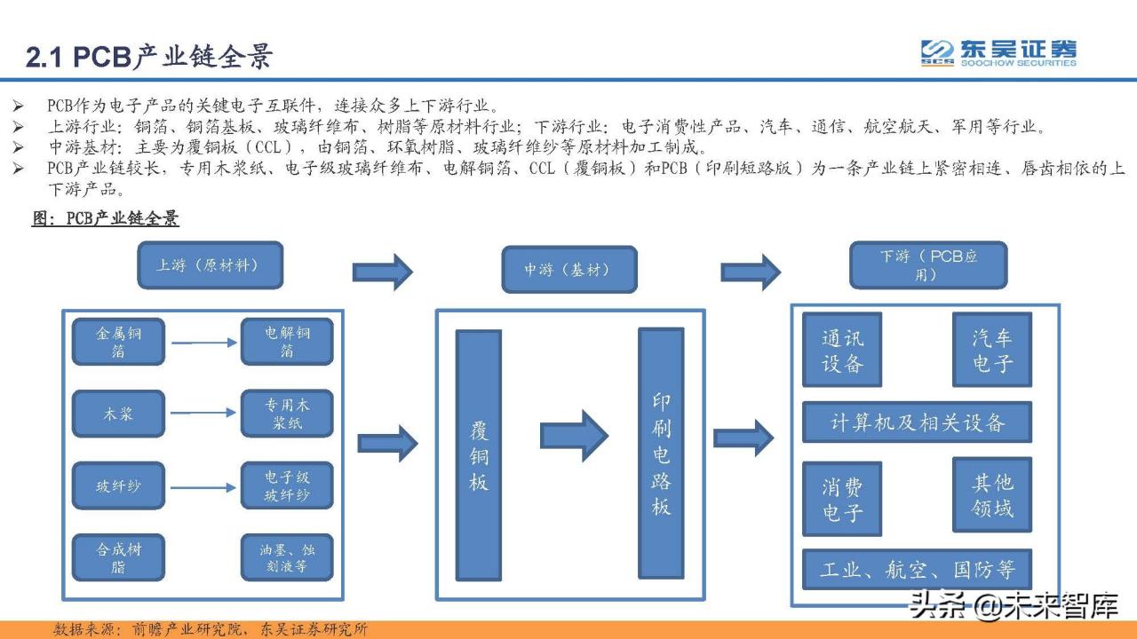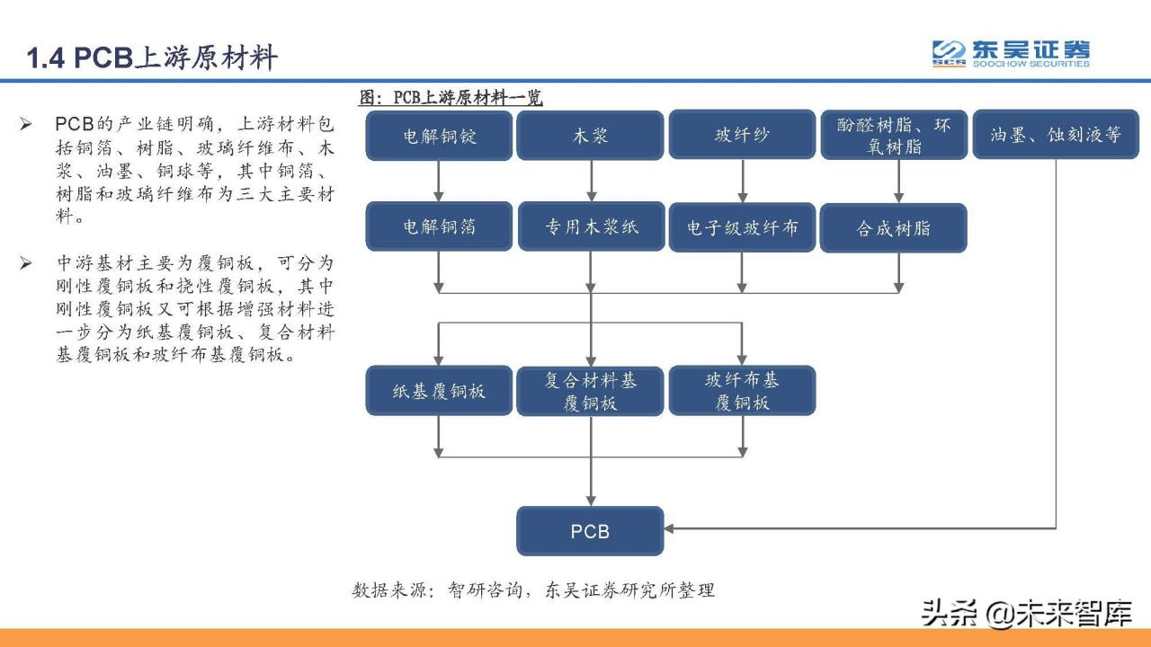 PCB作为电子产品的关键电子互联,连接着众多上下游产业。上游:铜箔、铜箔基板、玻璃纤维布、树脂等原材料行业;下游行业:电子消费品、汽车、通讯、航天、军工等行业。基材:覆铜板,主要由铜箔、环氧树脂、玻璃纤维纱等原料制成。PCB的产业链很长。特种木浆纸、电子级玻璃纤维布、电解铜箔、CCL(覆铜板)、PCB(印刷短路板)是一条产业链上的上下游产品,相互紧密联系,相互依存。
