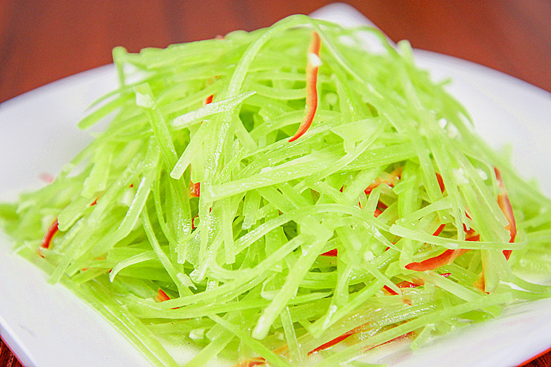 5.好了,简单家常的生菜丝做好了,鲜嫩,色泽鲜艳,清脆多汁。