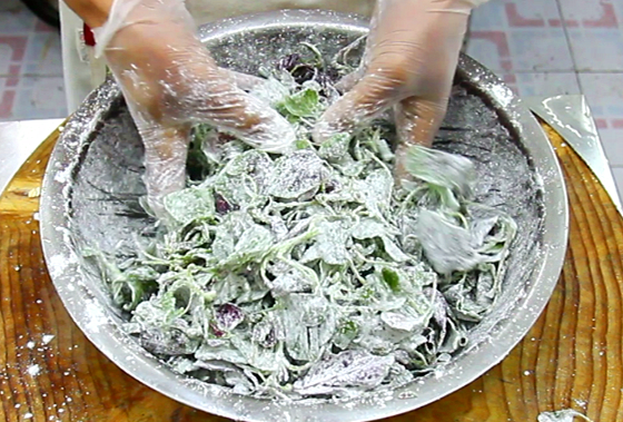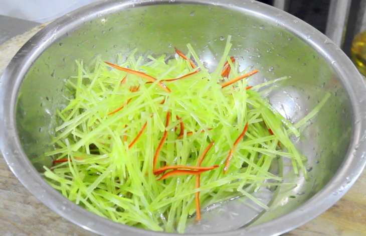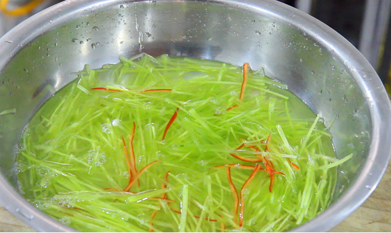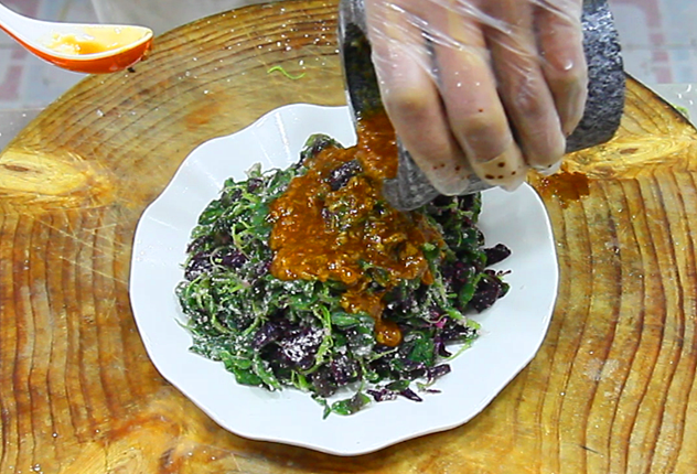 4.最后用漏勺控制生菜的含水量,和凉拌酱放在一起,用传统的人力方式在盆底滚上调味酱,使之和生菜丝融为一体。