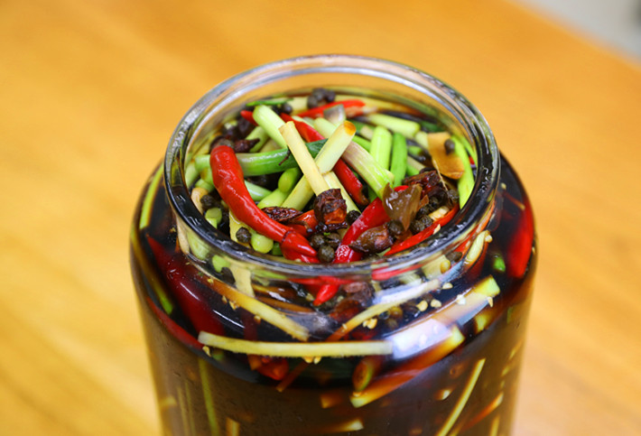 4.腌好以后把蒜苔取出来,腌出来的水分就不要了,然后把蒜苔放入干净的罐子里面,再准备一些小米椒段和姜丝,和蒜苔交叉着放,最后留一点小米椒、姜丝封口。倒入晾凉的腌料,淋上一些高度白酒,然后盖上盖子,上下摇晃几下,密封腌制两天就能食用了,腌的时间越长,越脆越入味。