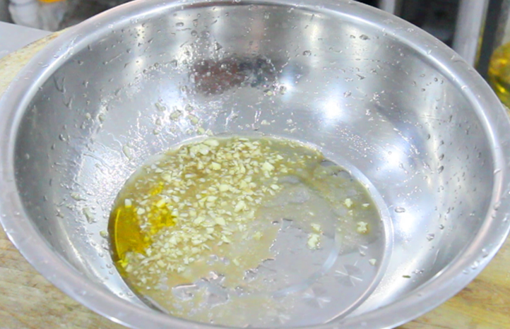 3.最后一步,我们做拌料,用蒜臼子捣一点蒜泥,捣蒜泥时加一点食盐,再倒入芝麻油,红油,生抽搅拌均匀后,倒在蒸好的苋菜上,也可以在拌散苋菜时拌入。