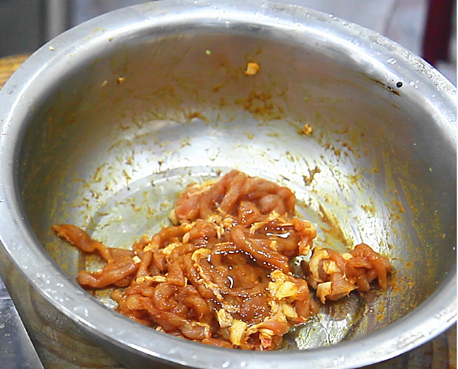 2.里脊肉一块,切成丝,然后把肉丝放入盆中,腌制一下。加入食盐2克,胡椒粉2克,料酒5克, 滴几滴老抽,增加底色,然后快速地搅动起来,再加入适量植物油搅拌,植物油能锁住肉丝的水分,使其口感更鲜嫩。