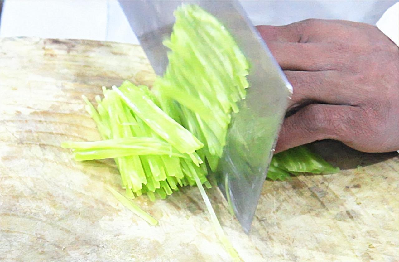 1.第一,剥生菜,不要小气,想剥多少就剥多少,可以多去一点,我们又不缺钱。然后,切成段、片、丝,做成沙拉。切丝越细越均匀,口感会越好。
