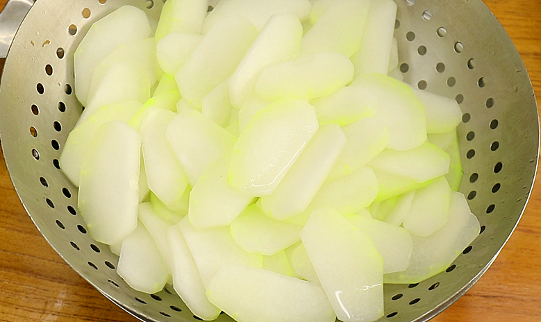 2.烧半锅开水,倒入冬瓜汆煮一下,大于30秒钟,冬瓜煮成半透明状就可以了,倒出来控一下水分。