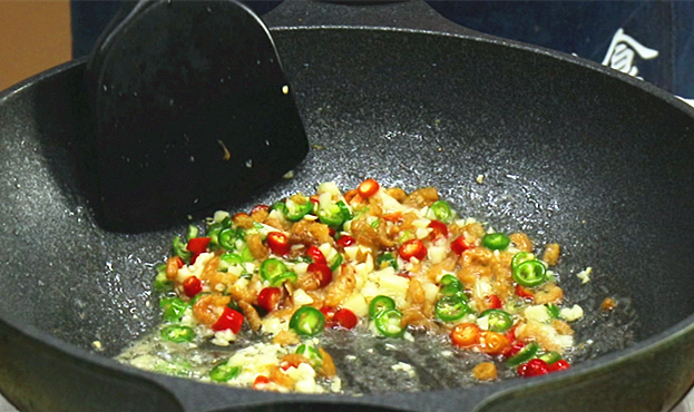 3.锅内烧油,倒入海米,小火煸炒一会,把香味煸出来,放入蒜末一起炒,炒出蒜香味,再倒入青红椒圈,继续炒,让香辣味充分地融合。