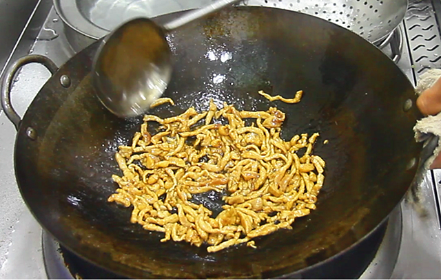 4.开始烹炒,锅里倒入植物油,充分滑锅后,倒出热油,加入凉油。热锅凉油,炒肉丝的时候不容易粘锅,当我们把肉丝炒变色后,盛出来倒在漏勺上,控油,炒肉丝一定要低温滑油,口感才够嫩。