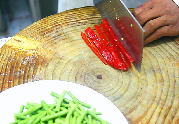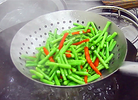 3.起锅烧水,先把长豆角焯一下水,水开后,倒入长豆角和红椒,焯水40秒左右,当长豆角变为青色,断生后,捞出控水,给长豆角焯水,是豆角清脆爽口不夹生的关键。