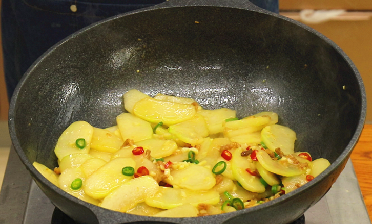 4.然后倒入冬瓜,转大火快速翻匀,加入生抽、食盐、白糖、鸡粉、蚝油,继续颠锅,把调料炒散、炒化,沿锅边淋入一点清水,把火调小一点,煨一会,方便入味,再勾入一些水淀粉,让汤汁更好地包裹在冬瓜表面,淋入明油提亮色泽,翻匀后就可以出锅了。