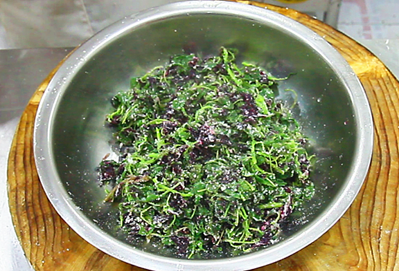 2.第二步,我们把苋菜上锅蒸一下,锅内烧水,放上蓖子,盖上锅盖,开大火,把水烧开后,放入拌好面粉的苋菜叶,苋菜非常好熟,一般蒸三分钟左右就可以了。三分钟后,把蓖子端出锅,把苋菜叶倒入盆中抖散,一定要在温度没有凉下来之前拌散,再撒上一点食盐,颠盘拌匀后,装在盘里。
