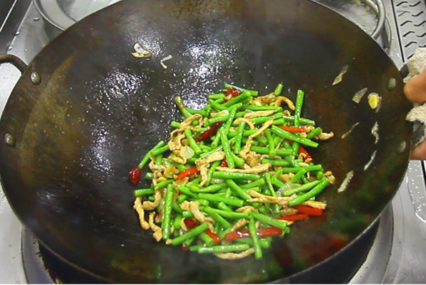 5.锅里再烧油,倒入葱蒜红干椒,爆出香味,再倒入豆角和红椒, 大火翻炒,看到豆角表皮起皱后,倒入肉丝,起锅调味,淋入料酒10克,蚝油5克,食盐2克,鸡粉2克,白糖2克,然后大火翻炒,化开调料。翻炒一会儿,勾入适量水淀粉,最后,开大火,把汤汁收至粘稠。