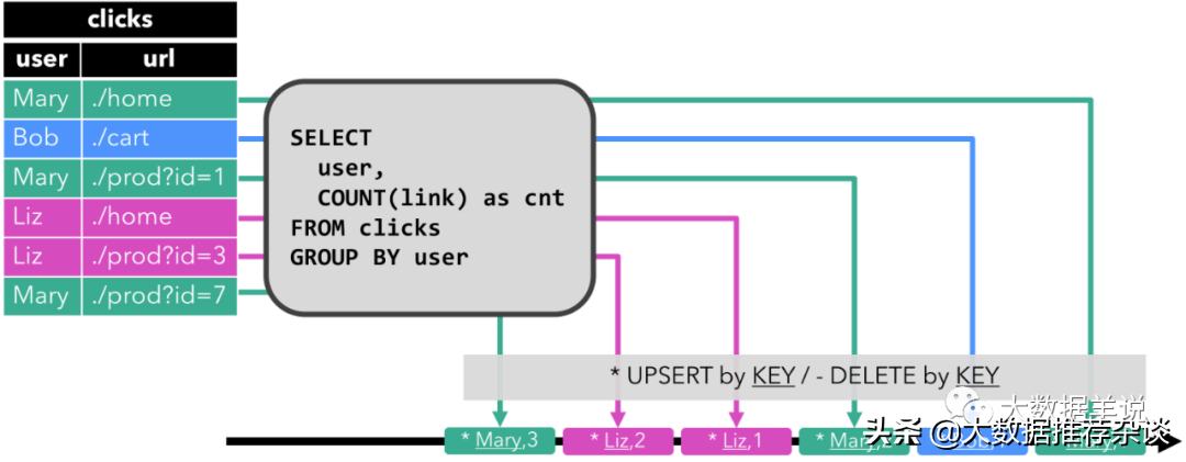 ⭐ 当第一行数据被插入到 clicks 表时,连续查询(Continuous Query)开始计算结果数据。数据源表第一行数据 [Mary,./home] 输入后,会计算结果 [Mary, 1] 插入(insert)结果表。⭐ 当第二行 [Bob, ./cart] 插入到 clicks 表时,连续查询(Continuous Query)会计算结果 [Bob, 1],并插入(insert)到结果表。⭐ 第三行 [Mary, ./prod?id=1] 输出时,会计算出[Mary, 2](user 为 Mary 的数据总共来过两条,所以为 2),并更新(update)结果表,[Mary, 1] 更新成 [Mary, 2]。⭐ 最后,当第四行数据加入 clicks 表时,查询将第三行 [Liz, 1] 插入(insert)结果表中。