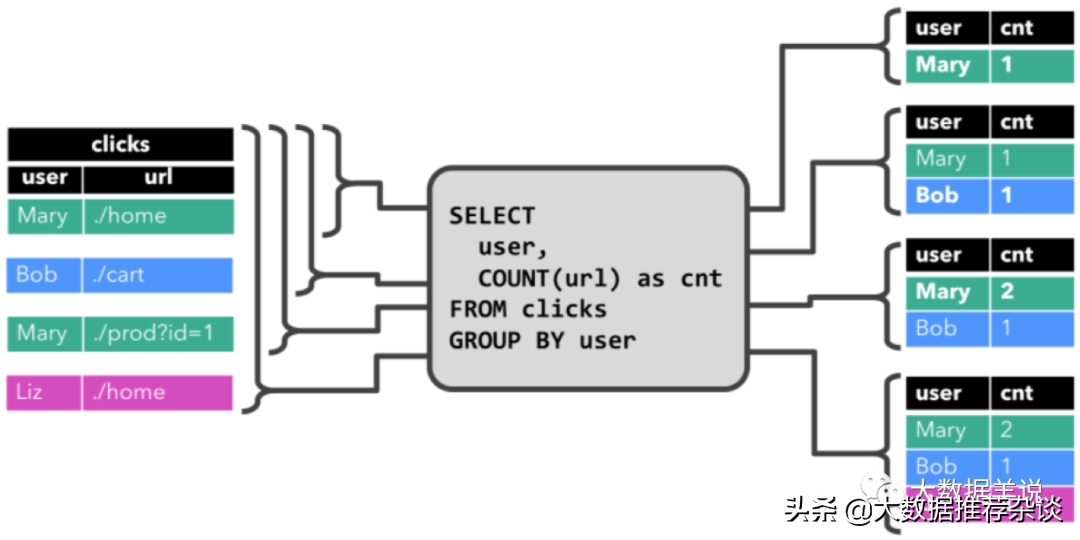 那么本案例中呢,是基于 clicks 表中 user 字段对 clicks 表(点击事件流)进行分组,来统计每一个 user 的访问的 URL 的数量。下面的图展示了当 clicks 输入表来了新数据(即表更新时),连续查询(Continuous Query) 的计算逻辑。