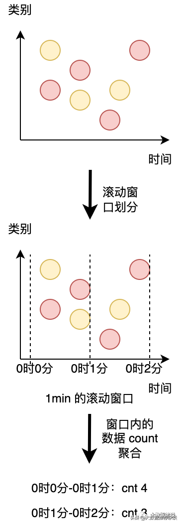我们的滚动窗口的步长为 1 小时,即时间粒度上面的分组为 1 小时。其中时间戳在 12:00:00 - 12:59:59 之间有四条数据。13:00:00 - 13:59:59 有三条数据。14:00:00 - 14:59:59 之间有四条数据。