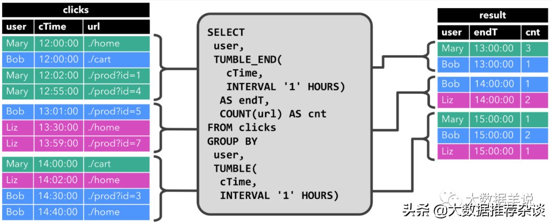 与前面一样,左边显示了输入表 clicks。查询每小时持续计算结果并更新结果表。clicks 表有三列,user,cTime,url。其中 cTime 代表数据的时间戳,用于给数据按照时间粒度分组。