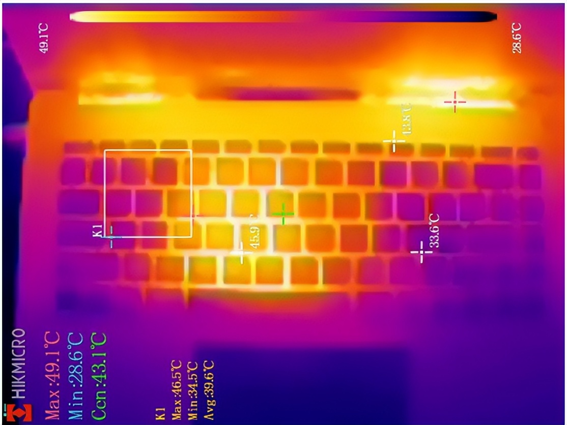 温度和噪音:键盘区域的热量聚集在键盘的中间,最高温度