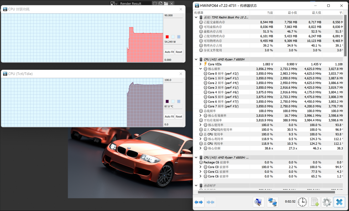 Redmi Book Pro 15 2022锐龙版测评:锐龙7 6800H加持,体验出彩的大屏轻薄猛机 在长期满负荷应用测试中,牛叔选择了Blender(3.0版)渲染来考察红米Book Pro 15 2022锐龙版的长期持续性能发布。上图为机器运行情况,稳定保持54W的持续输出功耗,凸显锐龙7 6800H的高能效比优势:小超标性能输出功耗下,全核频率接近4GHz。这对于笔记本来说非常重要。意味着当锐龙处理器的处理器满载时,可以输出强劲的性能,而不需要太高的功耗。游戏本和轻薄本都可以受益:可以降低整机功耗,减轻散热压力,进而设计更薄的机身。同时也说明了锐龙6000H处理器的续航优势。