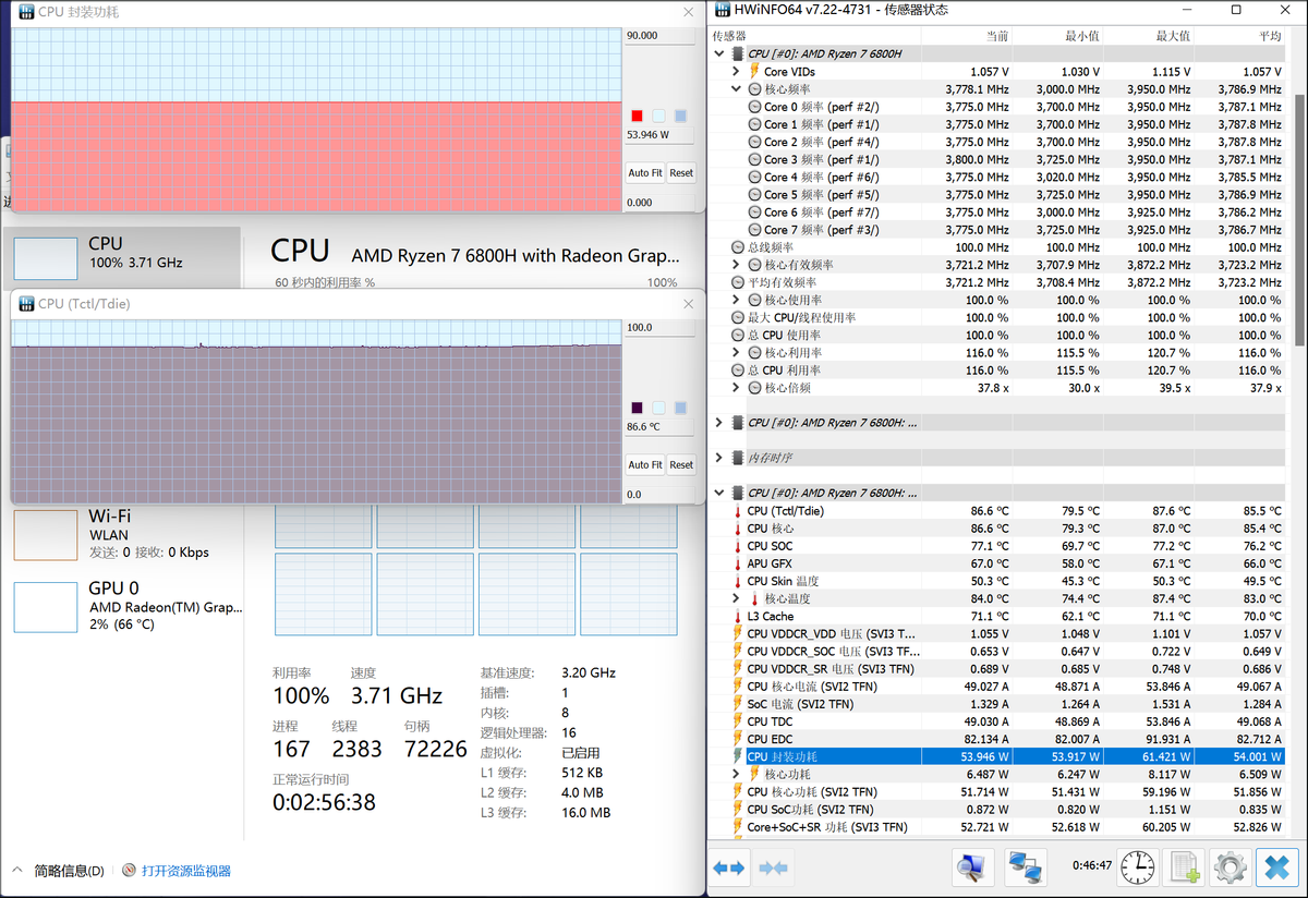 室温24左右,用Aida64测试红米Book Pro 15 2022锐龙版的处理器FPU(极速模式下)半小时以上。锐龙7 6800H最终稳定状态如下:处理器功耗54W,温度86左右,频率3.7GHz左右这个功耗显示在H处理器的轻薄本上,算是第一梯队的妥妥的性能释放。它很强大!