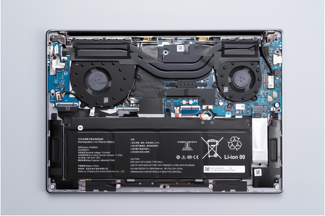 Redmi Book Pro 15 2022锐龙版测评:锐龙7 6800H加持,体验出彩的大屏轻薄猛机拆解图,双风扇双热管散热,采用全新飓风散热系统,散热结构重新设计,风路优化。从测试结果来看,性能令人满意。