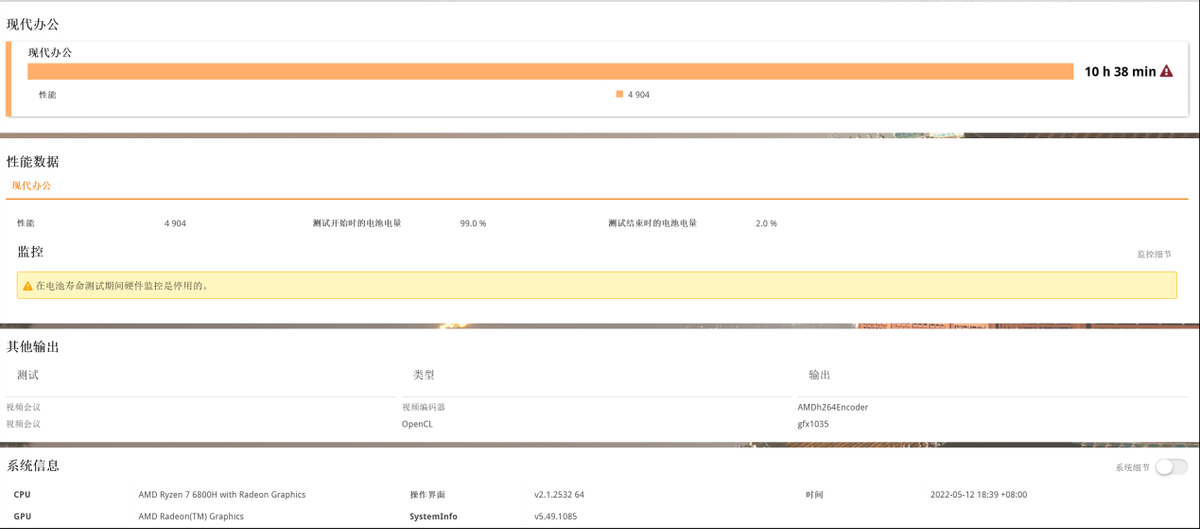 Redmi Book Pro 15 2022锐龙版测评:锐龙7 6800H加持,体验出彩的大屏轻薄猛机对了,红米Book Pro 15 2022锐龙版内置72Wh大容量电池。在实测的65%屏幕亮度、70%音量、90Hz设置下,播放本地720P视频3小时耗电20%。推测该机本地视频播放寿命可达14小时左右。另外,在线视频播放时间8.5小时左右,PCM。由于评测室测试环境环境光亮度和噪音较高,采用65%屏幕亮度和70%音量的设置。如果调到50%的屏幕亮度和50%的音量,它的续航会更好。同时相比上一代锐龙5000H系列搭载的Redmi Book Pro有了很大的进步,这也是锐龙6000H系列处理器高能效比的体现。