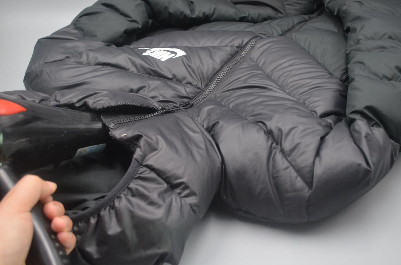第五步,我们来处理羽绒服中的羽绒问题。一般羽绒服洗完之后,里面的羽绒会散开,需要一段时间晾干。如果你遇到这样的问题,我教你一个解决方法。因为羽绒服都是区域清洗的,我想让里面的羽绒快点散掉。我们可以先把羽绒服的拉链拉上,然后打开吹风机的热风从领口向内吹,边吹边拍打羽绒服,让里面的羽绒快速散去。