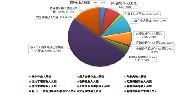 全年共颁发特种设备作业人员证书96400张。各类特种设备作业人员发证数量及比例见下图: