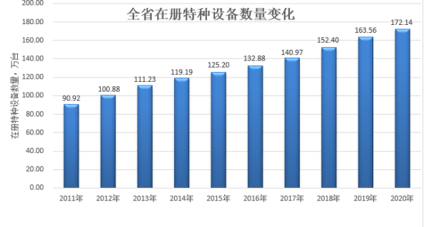 全省在册特种设备172.14万台(压力管道、气瓶除外),较2019年增长5.25%,其中锅炉3.49万台,压力容器42.18万台,电梯91.13万台,起重机19.17万台,场(厂)内特种机动车辆15.95万辆,客运索道24条等。还有气瓶3451万个,压力管道2.8万公里。2011年以来全省特种设备注册数量变化情况见下图: