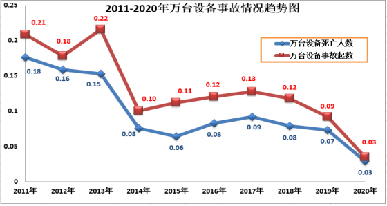 2011年以来万起特种设备事故趋势及2020年全省特种设备事故分类统计见下图: