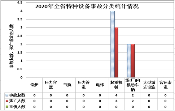 根据结案材料分析,事故主要是由于使用和管理不当造成的,占总数的100%。违章作业和安全管理不到位是事故发生的主要原因,表现为作业人员违章作业和操作不当。2020年特种设备事故占比见下图: