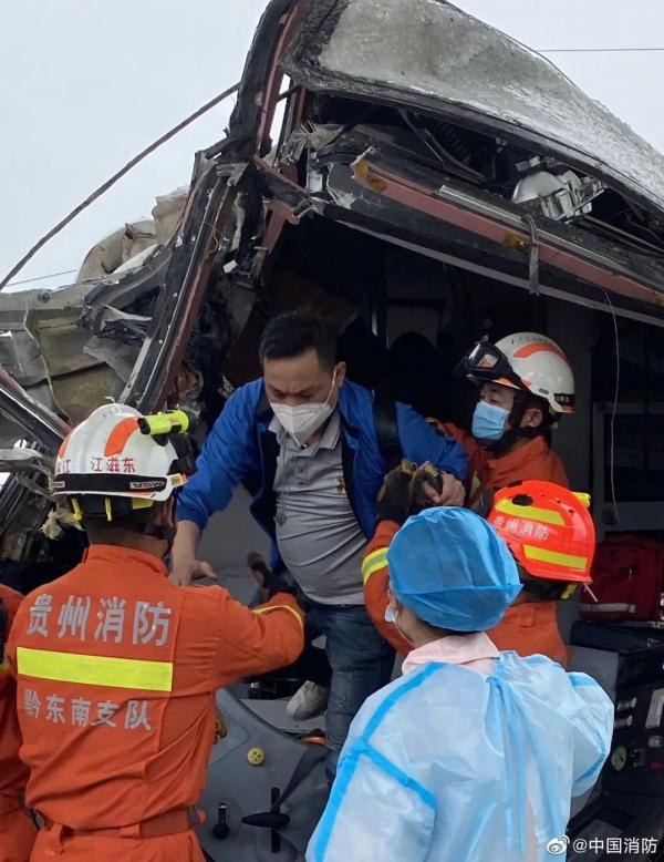 据@中国消防 消息,救援现场,贵州消防救援人员利用破拆工具打开变形车头,救助伤员,疏散被困人员。