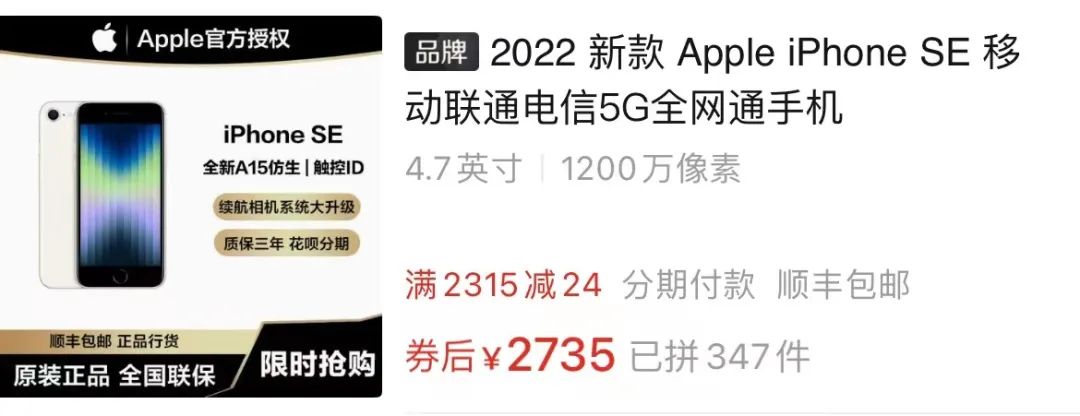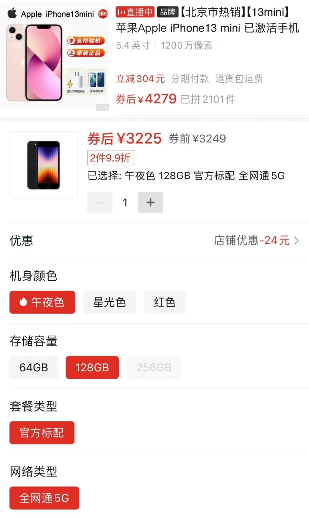 虽然 iPhone 13 mini 在电商平台价格也下降了,但同样的 128GB ,也要比 SE3 贵上 1000 元左右。