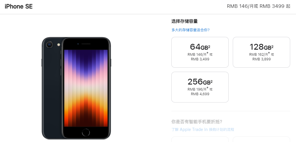 从目前苹果官网的价格来看, iPhone SE3 的价格会更加便宜,目前 64GB 的起售价格为 3499 元起。