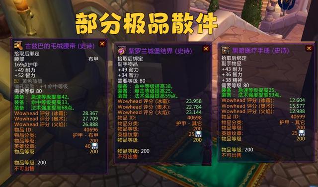 备件方面,有三个非常不错的极品法器,分别是古兹巴的毛绒带,紫罗兰城堡结界,黑暗医疗手册。