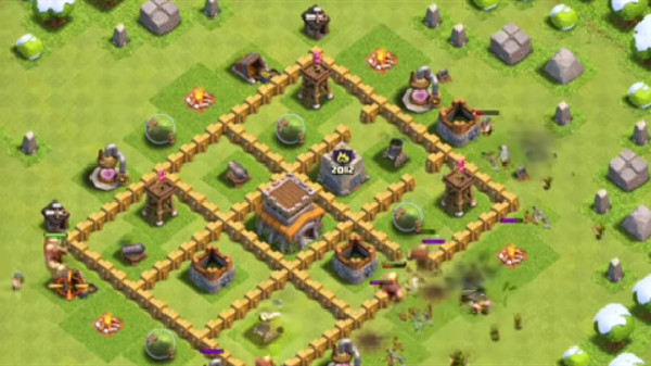 2.五点,出胖子解堡,补几个蛮族和弓箭手。六点钟方向,胖子和轰炸机会负责下面的炮塔。