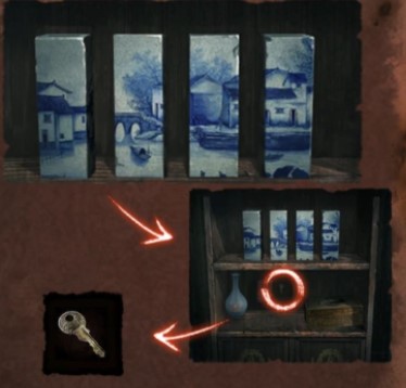 2.然后点开挂在墙上的山水画。这幅风景画可以排在左边。大家记得看一下。记住后,点击右上角的柜子开始翻瓷。放入暗格后,可以在暗格中获得一把钥匙。