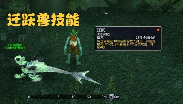 第二个是迁跃兽,这款宠物自带一个名为迁跃的技能,效果是传送到目标身边,同时获得闪避技能,持续四秒。胖哥测试了一下,这个技能就是法师的闪现,不仅可以位移,还可以解除控制。