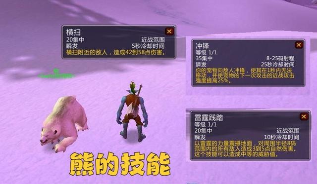 第三个是熊,这个宠物自带一个名为横扫的技能,技能效果与熊德的横扫完全一致,可以攻击附近的所有目标。